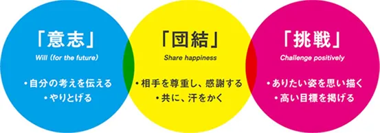 - 私たちは、一人ひとりが強い「意志」を持ち、ステークホルダーの皆様とともに、「団結」して高い目標に「挑戦」することで、次の世代へつなぎます